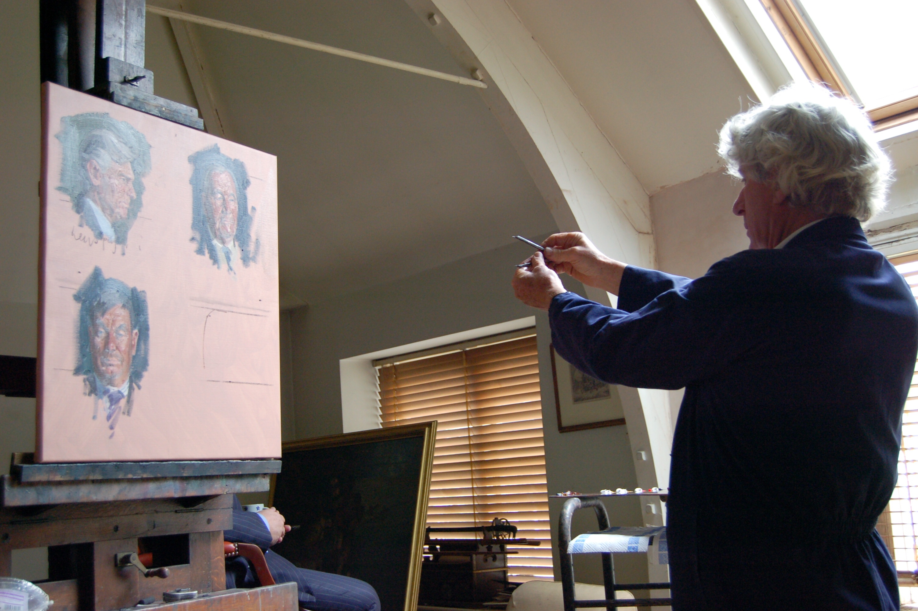 Andrew Festing beginning the portrait study. Note the already established top and bottom limits of the portrait, as indicted by the two horizontal lines on the canvas. Also on the canvas you can see the previous completed head studies