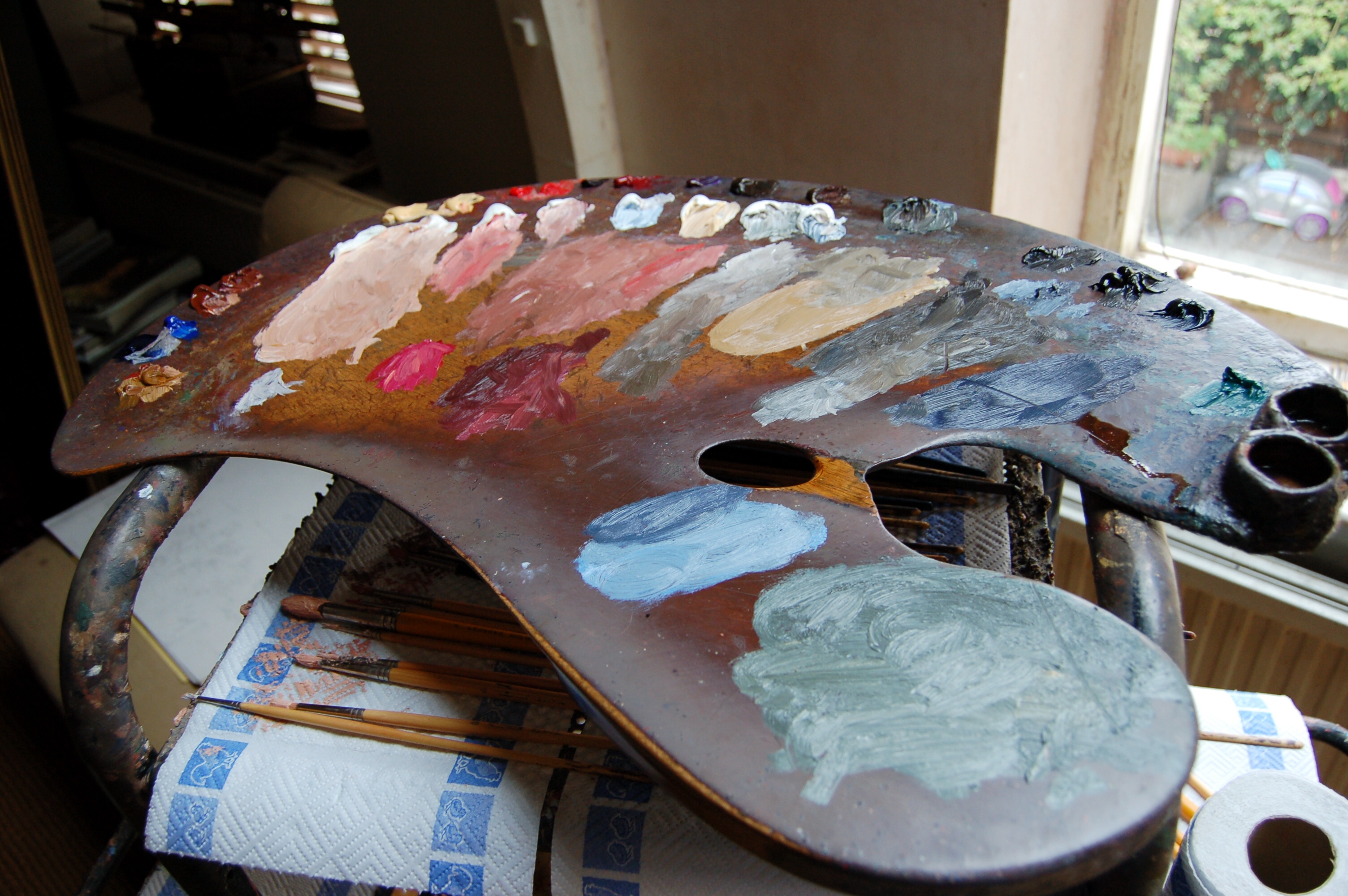 Andrew Festing’s Palette. Note the separate pools of colour which were premixed before beginning painting. There are also 6 or 7 whites placed on the palette to facilitate clean & quick mixing of colours