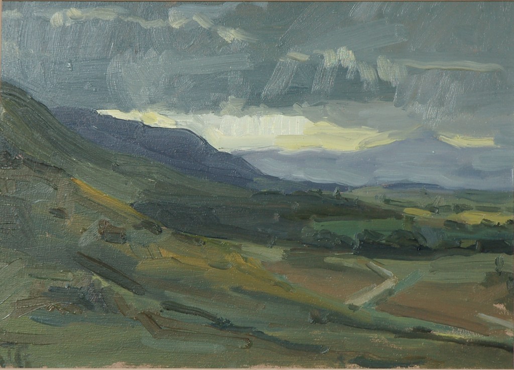 Finished painting from the banks of the Usk. Oil on Board. by Joe Galvin